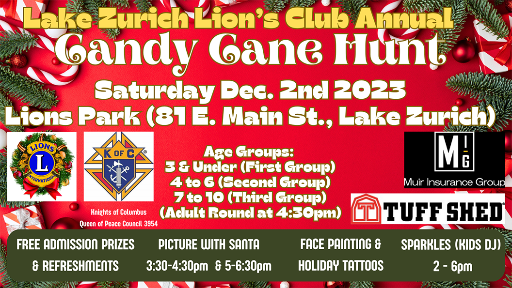 The Lake Zurich Lions Club will be hosting their 19th Annual Candy Cane Hunt in Lions Park on Saturday, December 2nd. The event will begin at 3 pm sharp, regardless of the weather.